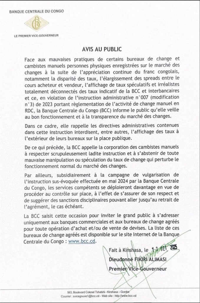 Kinshasa — La Banque Centrale du Congo (BCC), gardienne de la stabilité monétaire, a tapé du poing sur la table. Face à une série de « mauvaises pratiques » observées sur le marché des changes, notamment de la part de bureaux de change et de cambistes manuels, l’institution a publié un Avis au Public ferme ce 13 octobre 2025. L’objectif est clair : restaurer l’ordre et la transparence dans un secteur vital pour l’économie nationale.
