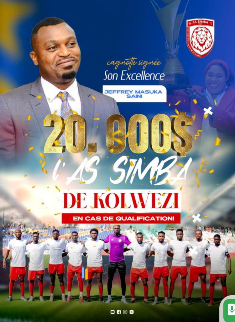 Kolwezi, RDC – L’Association Sportive Simba de Kolwezi est plus que jamais sur un nuage. Après des performances remarquables, le club phare de la province du Lualaba se voit offrir une motivation supplémentaire de taille par un de ses illustres fils. Une prime exceptionnelle de 20.000 dollars américains a été promise aux « Kamikazes » en cas de qualification pour la prochaine étape de leur parcours en compétition africaine.