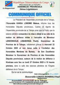Ce report n’est pas anodin. Le communiqué, signé par l’Honorable LOKESA BOMBOLI Paul, Rapporteur de l’Assemblée, indique clairement que le changement de date est la conséquence d’une « invitation » des Honorables Membres du Bureau, de Son Excellence Monsieur le Gouverneur de Province et des Honorables Députés provinciaux, auteurs de la motion de défiance à Kinshasa.