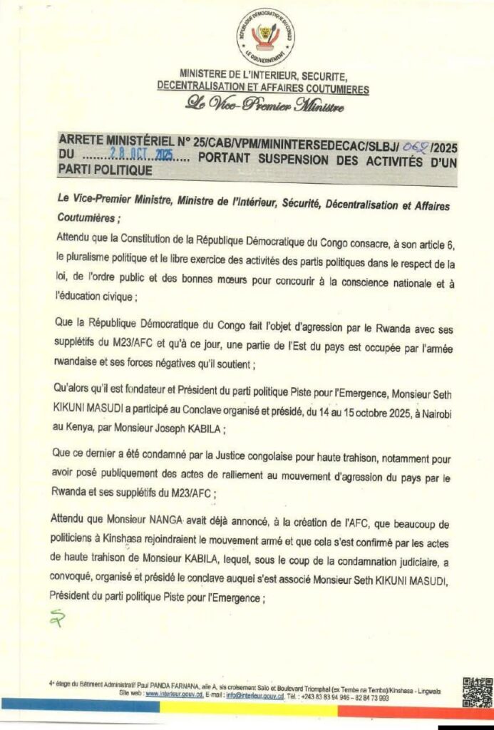 Kinshasa sous Tension – La République Démocratique du Congo a connu un nouvel épisode spectaculaire dans la guerre politique qui oppose le pouvoir en place à l’ancienne majorité. Par deux Arrêtés Ministériels datés du 28 octobre 2025, le Vice-Premier Ministre, Ministre de l’Intérieur, Sécurité, Décentralisation et Affaires Coutumières, Shabani Lukoo Bihango J., a ordonné la suspension des activités de deux partis politiques sur toute l’étendue du territoire national.