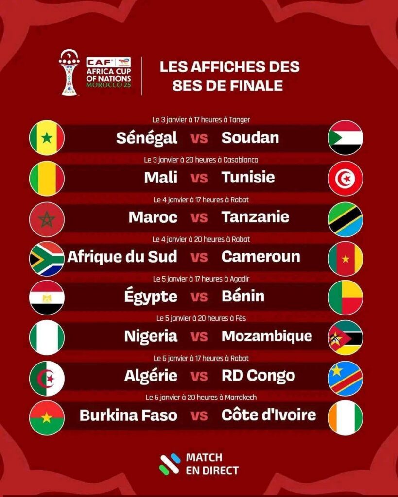Le tableau des huitièmes de finale de la Coupe d’Afrique des Nations « Maroc 2025 » est tombé. Entre duels maghrébins, revanches historiques et l’entrée en lice des favoris, le continent va vibrer dès demain. Le point d’orgue ? Un Algérie-RDC qui s’annonce électrique à Rabat.